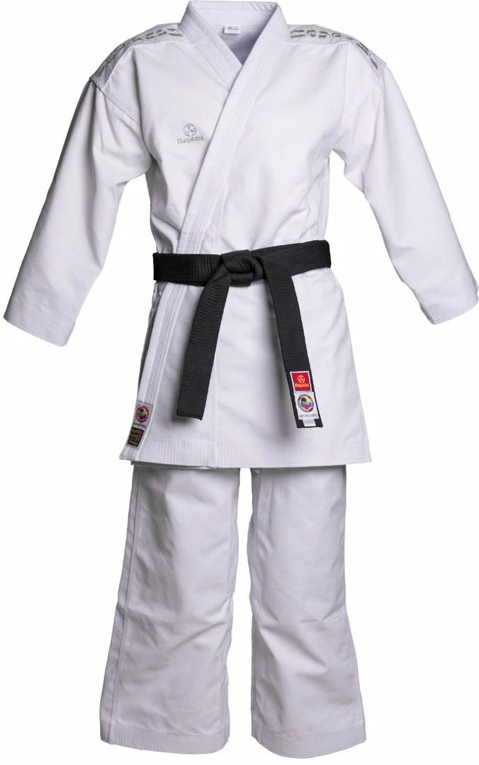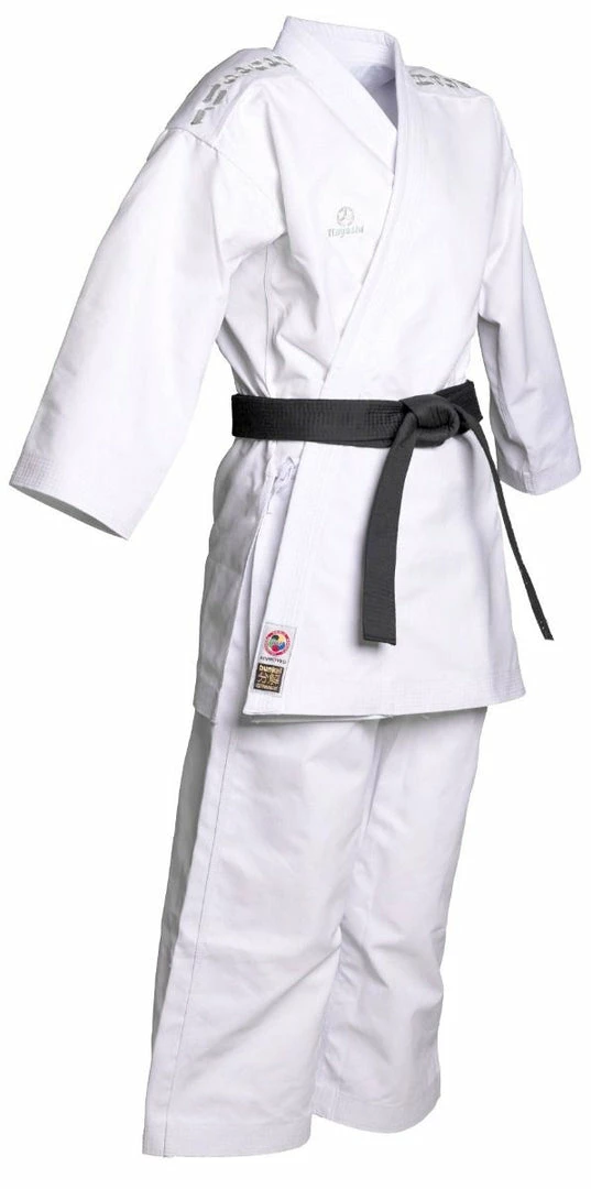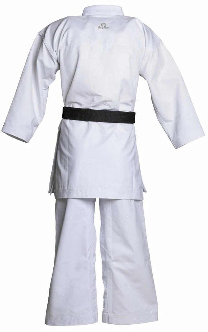 What the old masters already knew was correctly implemented by Hayashi in karate gi “Bunkai.” The extra heavy cotton blend convinces with stability and a high structural density. Moisture can be absorbed so quickly and is discharged to the outside. The noisy material also ensures an impressive snap effect on the mat. The “Bunkai” is a competition Gi for the kata area and made in traditional Japanese cut. The generous length of the Uwagi, with its side slits, falls well over the trousers. With an extra-wide crotch, this ensures maximum freedom of movement. The absolute highlight of the “Bunkai” is the Hayashi gloss embroidery in either white, red or blue, which can be seen in the shoulder area, on the chest, and in the neck.