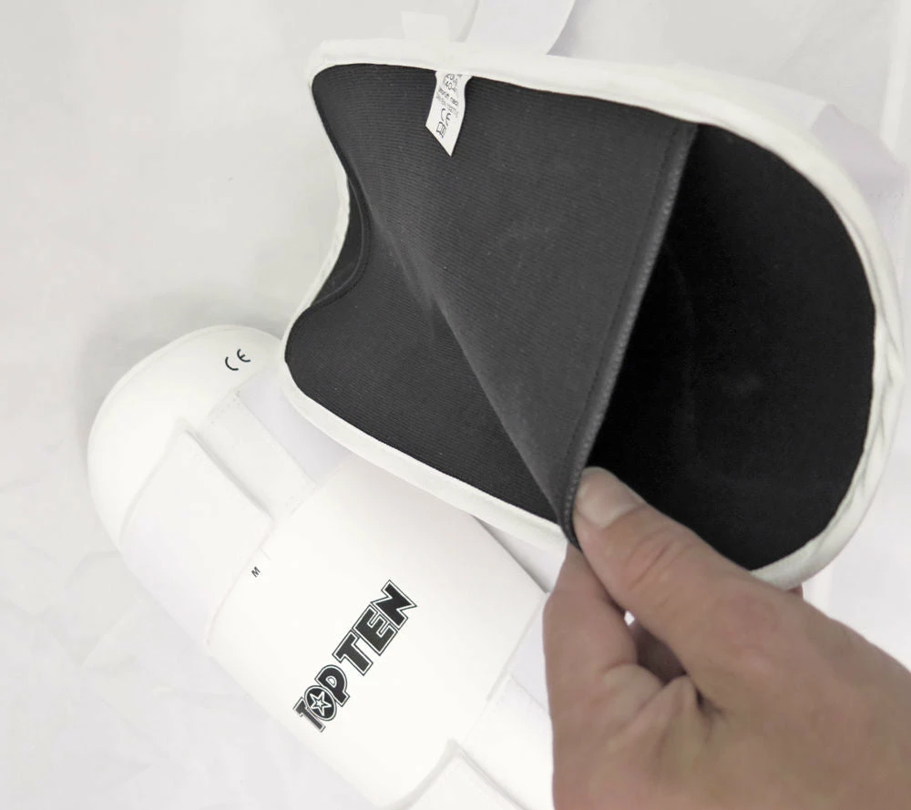 TOP TEN Pre-shaped shinguard with high density foam. Covered with synthetic leather. These shin guards are used for point-fighting sparring and competition in WAKO tournaments and on the open karate tournament circuit. Suitable for light-contact in combination with safety kicks.