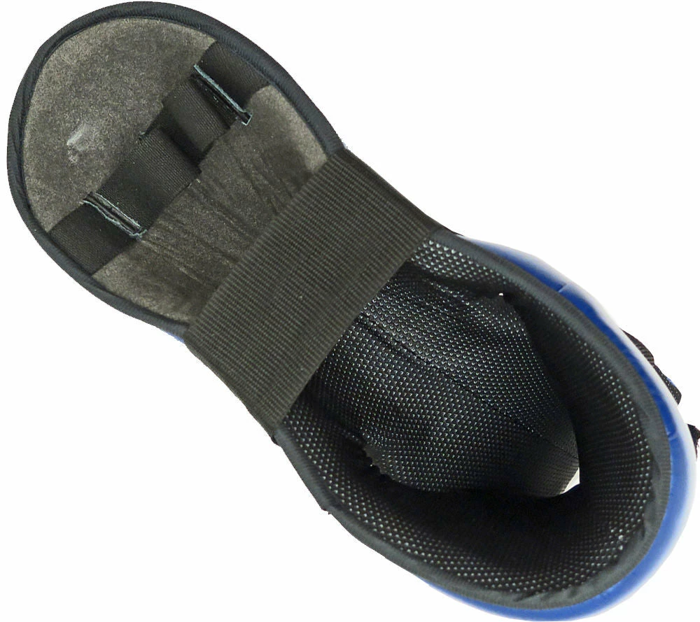 A wide industrial strength strap wraps around ankle and foot then attaches with strong Velcro for a tighter closure.