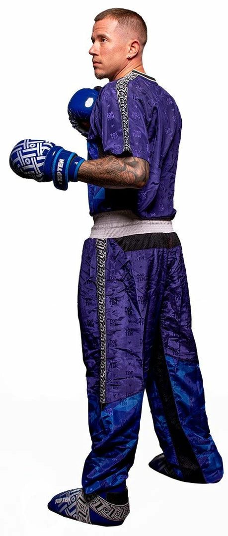 Brings together what belongs together. The long โPrismโ kickboxing pants by TOP TEN combine comfortable casualness with the demands on functional sportswear. There is also an incomparable style with a graphic โPrismโ print and a woven TOP TEN structure. The straight cut of the pants has an extra kick insert in the crotch so that the โPrismโ can withstand extreme loads. The mesh inserts in the inner leg area and on the back waistband ensure great wearing comfort. A special dividing seam sets a visual accent and guarantees a comfortable fit on the leg without twisting or sliding up. The finishing touches for an athletic look are brought to the โPrismโ kickboxing pants by the woven tape on the outer seam.